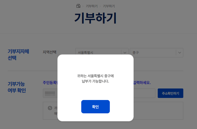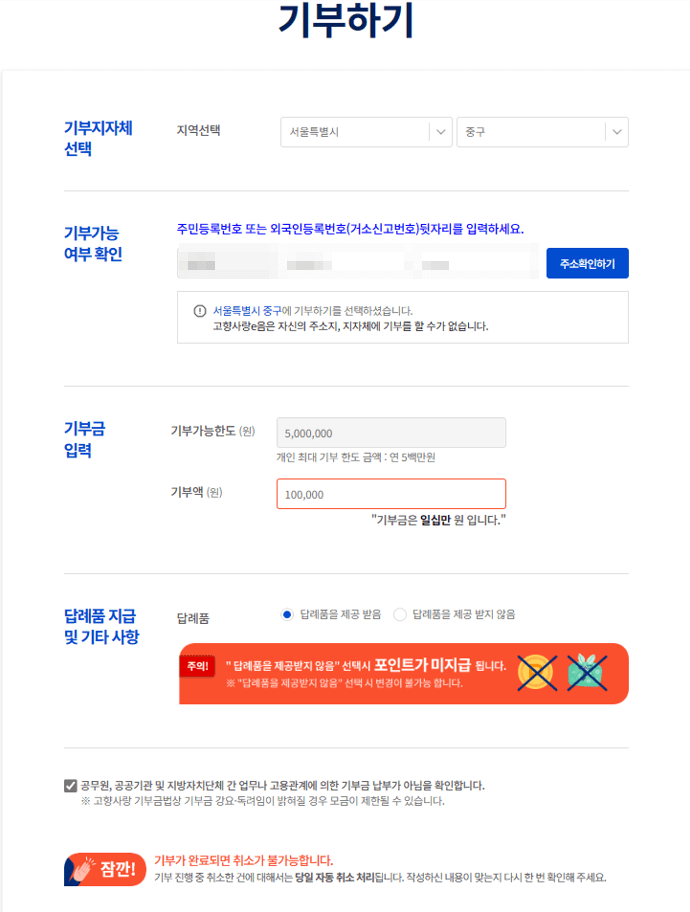 먼저 기부할 지역을 선택하고 본인 주민등록번호를 입력한 뒤 '주소확인하기' 버튼을 클릭해 기부 가능 여부를 확인합니다. 기부액을 잘 확인하시고 금액을 입력하고 반드시 '답례품을 제공받음'이 체크되어 있는지 확인하고 다음 단계로 진행합니다(체크하지 않으면 답례품을 받을 수 없으니 주의하세요!)