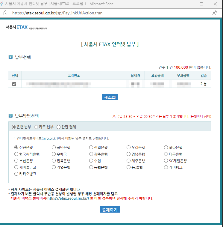 그 후 납부방법을 선택하면 되는데 은행 납부, 카드 납부, 간편 결제로 납부가 가능합니다. 은행의 경우 23:30 ~ 00:30 까지는 납부가 불가하니 참고하시기 바랍니다.