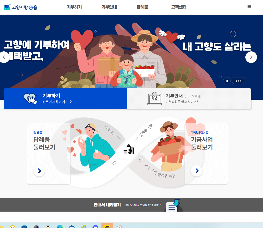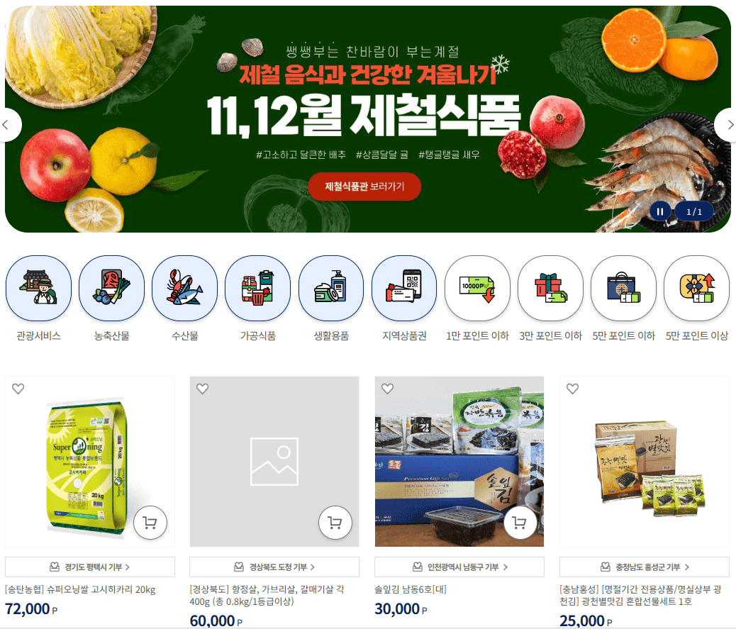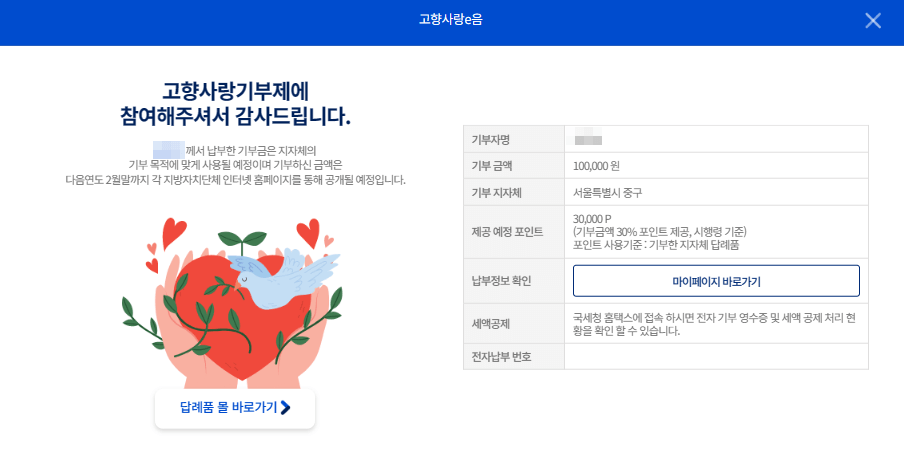 - 고향사랑 e음 종합정보시스템에서 고향사랑 기부 포인트 발급 및 기부한 지자체 답례품 선택