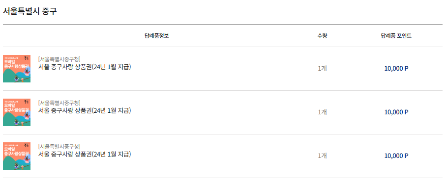 저는 서울시 중구를 선택해서 중구사랑상품권을 선택했습니다. 농산물 특산품도 좋아하지만 아무래도 일상에서 가장 사용이 쉬운 상품권을 선택하는 것이 고민을 덜 하게 될 것 같아 골랐으니 다들 마음에 드는 답례품 고르시기 바랍니다.