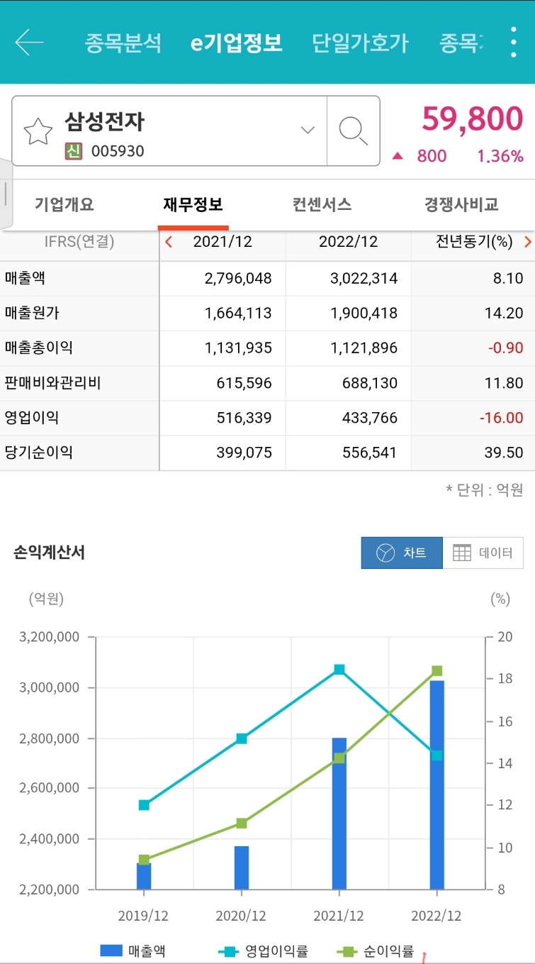 기업의 부동산 자산이나 외환, 투자 자산이 증가하여 늘어난 이익 같은 경우를 포함한 것은 당기 순이익이라고 표현한다. 영업이익을 포함한 특정 기간의 총순이익을 말하는 것으로 영업이익이 높은데 당기순이익이 낮다면 영업이익으로 벌어들인 수익이 엄한 곳에 쓰이고 있는지 확인해봐야 할 것이다. 당기순이익의 경우 일시적인 이익일 수 있으니 참고하기 바란다. 삼성전자의 경우 반도체 업황이 안 좋아지고 재고 처리 문제 등 당면한 문제가 있어서 매출액은 증가했지만 영업이익은 감소한 것으로 보인다.