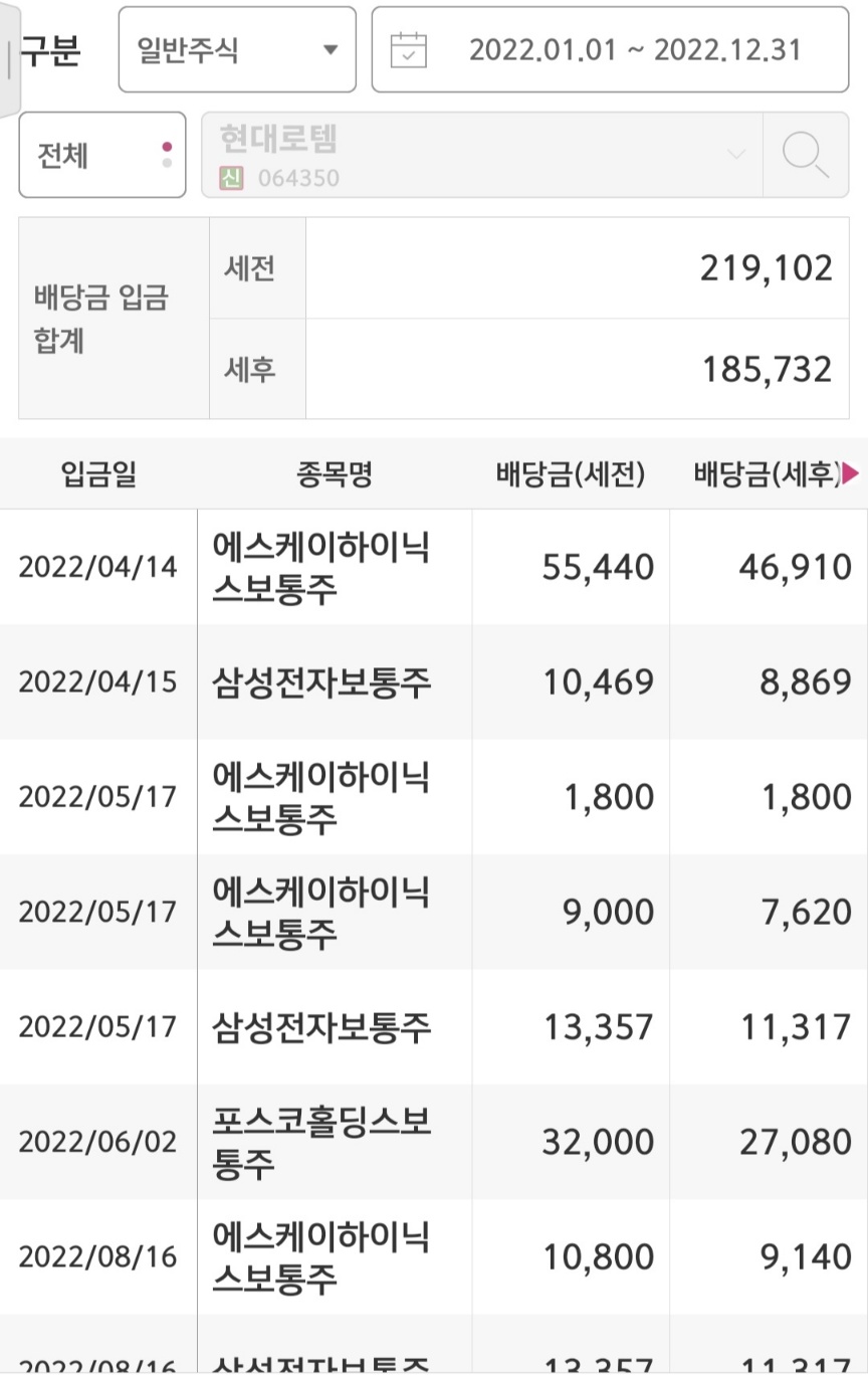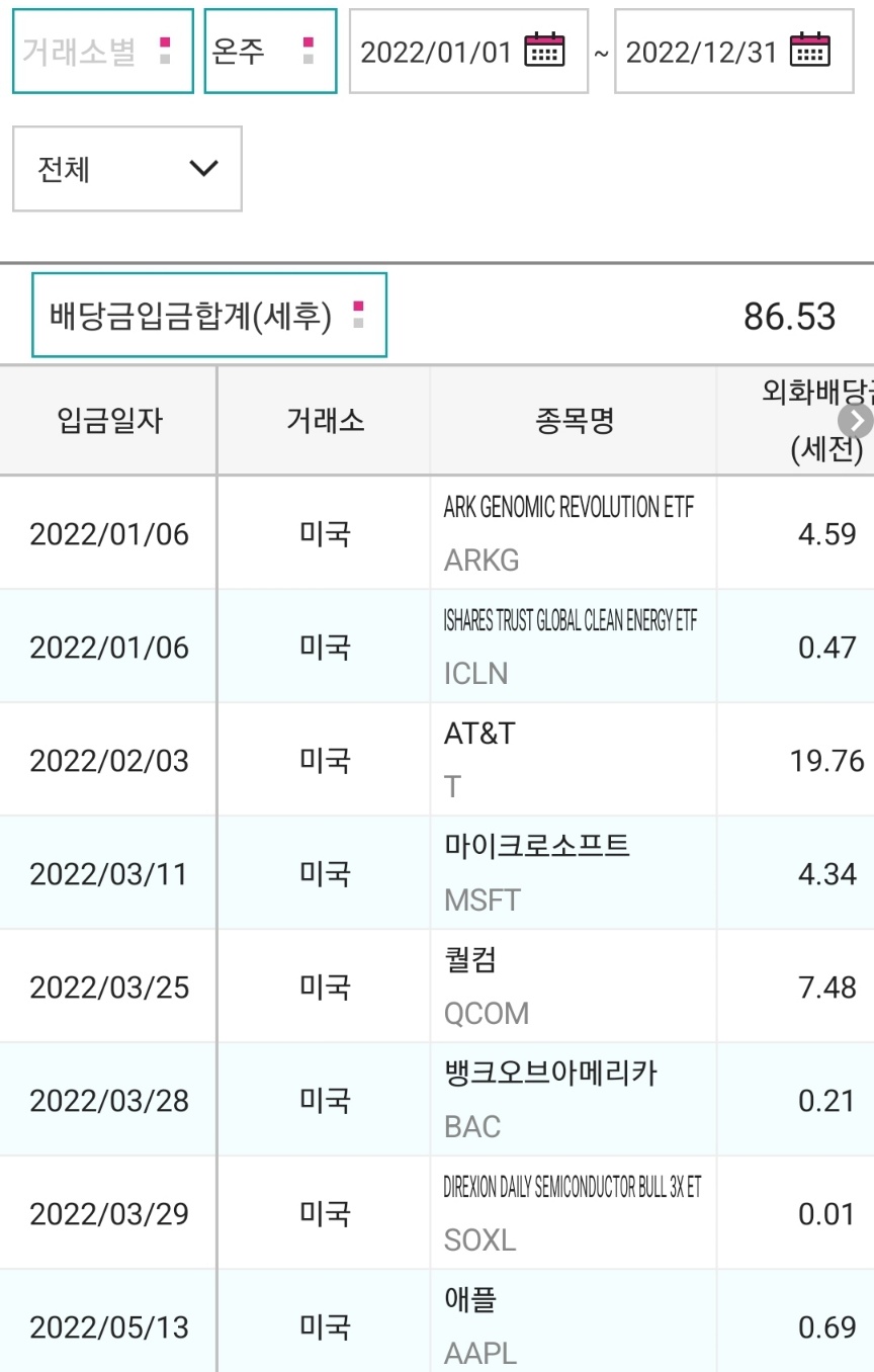 기존에 배당금 투자에 대해 관심이 없던 필자의 2022년도 배당 지급은 다음과 같다.