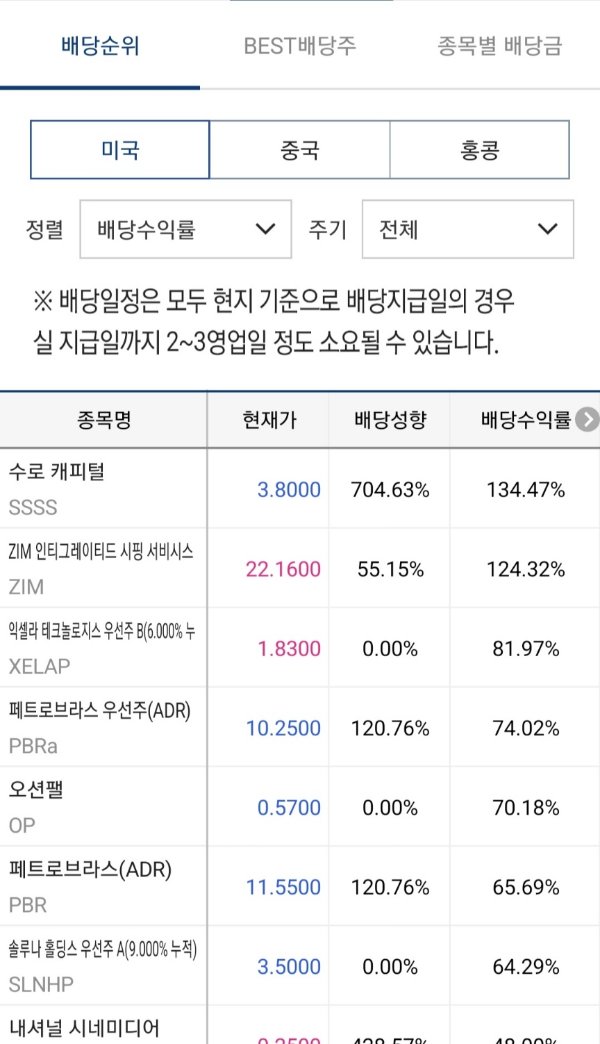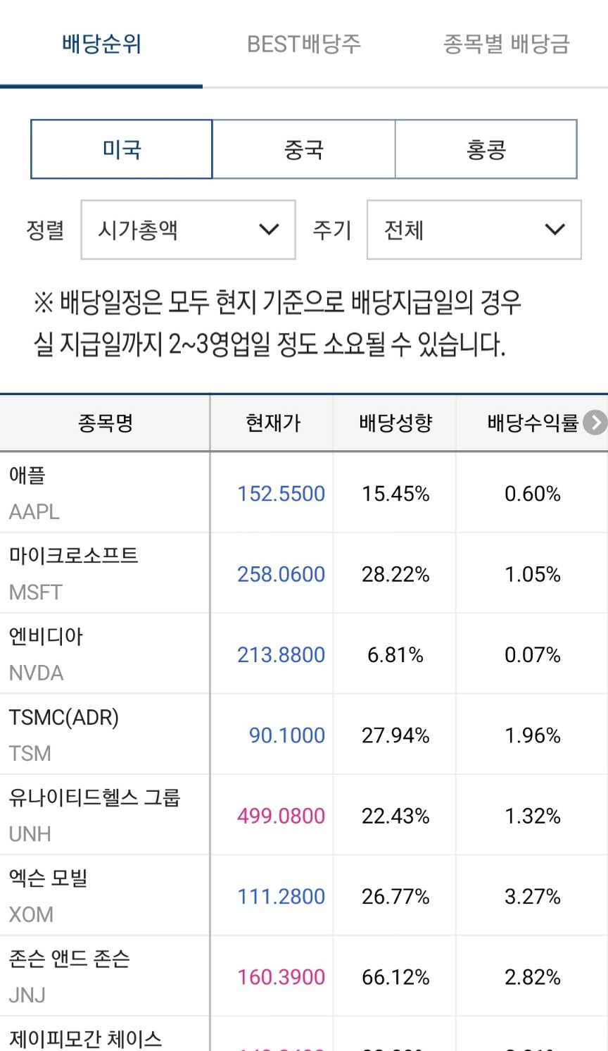처음 배당주 투자를 시작하면 아무래도 그래서 배당률이 몇 퍼센트인 게 중요하지 않냐고 생각할 수 있다. 필자는 키움주식 영웅문을 사용하는데 영웅문 해외주식 어플을 켜서 "배당투자전략"을 보면 첫 정렬기준이 배당수익률로 제일 위에 있는 주식의 배당수익률은 130%가 넘는다. 100만 원 투자하면 130만 원을 돌려주는데 정말 미친 주식이다! 싶을 수 있지만 바로 옆에 배당성향을 보면 약 700%로 버는 돈의 700%를 배당금 지급에 사용한다는 뜻이다. 배당성향이란 단기순이익 중 배당금의 비율로 높을수록 주주 친화적이고 투자가치가 있지만 너무 높으면 기업 재무구조를 악화시킬 수 있다. 통상 적정 배당성향은 20 ~ 40% 정도라고 생각한다. 기업의 본질은 사업을 해서 수익을 얻고 수익을 재투자해서 성장하는 것으로 적절한 배당은 좋지만 과한 배당은 오히려 성장을 저해시킬 수 있다고 본다. 정렬 기준을 시가총액 기준으로 정렬하면 우리에게 친숙한 기업들이 많이 보인다. 배당주 투자도 그렇지만 모든 투자는 내가 잘 아는 것에 먼저 접근해야 한다고 생각한다.