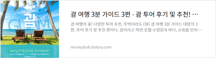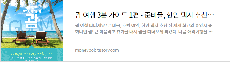 | 괌 여행 3분 가이드 2편 - 호텔 예약 사이트 추천! 최저가 예약 (0) | 2023.05.07 |